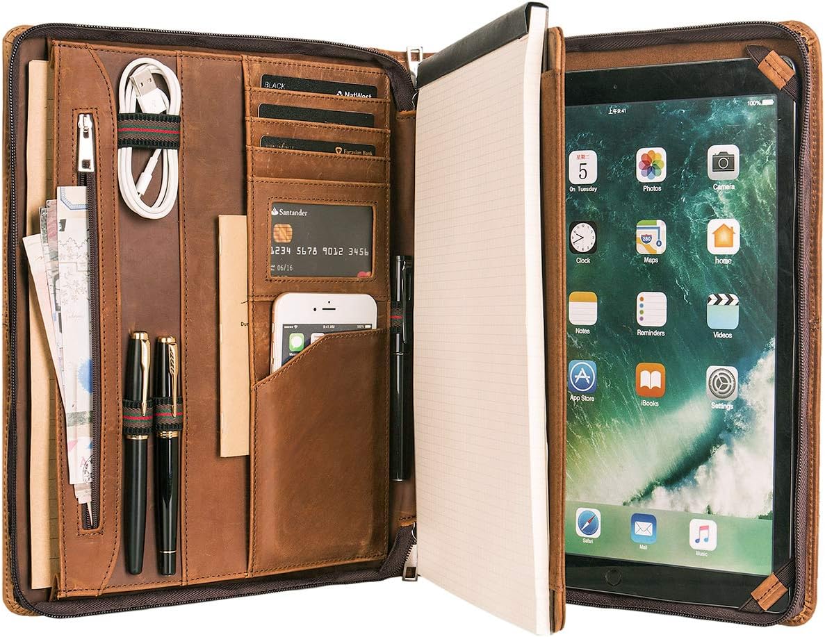 Schrijfmap leder A4 conferentiemap organizer met ritssluiting, hoogwaardige lederen map met schrijfblok houder, tablet map voor iPad Pro 12.9 (2018/2020), bruin: Amazon.nl
